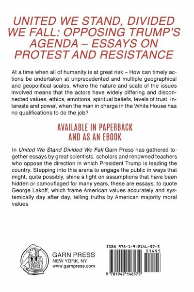 In United We Stand Divided We Fall Garn Press has gathered together essays by great scholars and renowned teachers who oppose the direction in which President Trump is leading the country. These are essays, to quote George Lakoff, which frame American values accurately and systemically day after day, telling truths by American majority moral values. These are essays of protest against and resistance to Trump’s presidency, to his billionaire cabinet, to the privileging in the White House of white supremacists, the promulgation of "alternate facts", the denigration of media sources, the purges of State Department personnel, the gag orders at the EPA and scientists placed on "watch lists", the travel bans on people from wide swaths of U.S. society and on refugees … the list is long. They are also essays that tackle the question of what we can do to stop Trump from becoming a fast moving catastrophe. When the hands of the Doomsday Clock were moved closer to midnight, President Trump was named specifically as an existential risk to humanity. There is no doubt that we must all act. The writers of conscience who have written this collection of essays are all actively engaged in opposing President Trump and their writings encourage us to participate in the resistance movement. Read with a pencil in hand. Make notes on what you can do to join aspects of the movement that reflects the needs and concerns of your community. Through social media you can go global while acting locally.