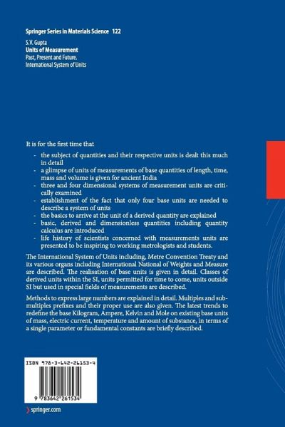 It is for the first time that the subject of quantities and their respective units is dealt this much in detail, a glimpse of units of measurements of base quantities of length, time, mass and volume is given for ancient India, three and four dimensional systems of measurement units are critically examined, establishment of the fact that only four base units are needed to describe a system of units, the basics to arrive at the unit of a derived quantity are explained, basic, derived and dimensionless quantities including quantity calculus are introduced, life history of scientists concerned with measurements units are presented to be inspiring to working metrologists and students. The International System of Units including, Metre Convention Treaty and its various organs including International National of Weights and Measure are described. The realisation of base units is given in detail. Classes of derived units within the SI, units permitted for time to come, units outsideSI but used in special fields of measurements are described. Methods to express large numbers are explained in detail. Multiples and sub-multiples prefixes and their proper use are also given. The latest trends to redefine the base Kilogram, Ampere, Kelvin and Mole on existing base units of mass, electric current, temperature and amount of substance, in terms of a single parameter or fundamental constants are briefly described.