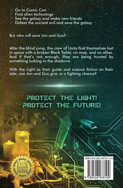 2023 WINNER of The Next Generation Indie Book Awards in Science Fiction category! * Go to Comic Con [check] * Find alien technology [check] * See the galaxy and make new friends [check] * Defeat the ancient evil and save the galaxy [check] But who will save Jon and Gus? After the blind jump, the crew of Unity find themselves lost in space with a broken Black Table, no map, and no allies. And if that's not enough, they are being hunted by something lurking in the shadows. >PROTECT THE LIGHT! PROTECT THE FUTURE!