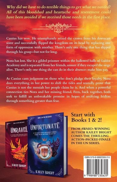 Why did we have to do terrible things to get what we needed? All of this bloodshed and heartache and resentment could have been avoided if we received those needs in the first place. Cassius has won. He triumphantly seized the crown from his downcast sister and successfully flipped the kingdom on its head by replacing one form of oppression with another. There's only one thing that has slipped through his grasp-but not for long. Nora has lost. She is a gilded prisoner within the hallowed halls of Galdor Academy and is separated from her friends, unsure if they escaped the siege alive. There's only one thing she can do in their absence: make him pay. As Cassius casts judgment on those who don't pledge their loyalty, Nora does everything in her power to shift the tides and soundly prove that Cassius is not the messiah her people claim he is. And when a powerful connection ties Nora and her missing friend, Fern, back together, both seek to fulfill an unbreakable promise in hopes of unifying Iridion through something greater than fear. From award-winning author Kailey Bright comes the thrilling action-packed finale in the UN series.