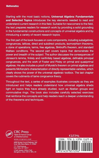 Starting with the most basic notions, Universal Algebra: Fundamentals and Selected Topics introduces all the key elements needed to read and understand current research in this field. Based on the author's two-semester course, the text prepares students for research work by providing a solid grounding in the fundamental constructions and concepts of universal algebra and by introducing a variety of recent research topics. The first part of the book focuses on core components, including subalgebras, congruences, lattices, direct and subdirect products, isomorphism theorems, a clone of operations, terms, free algebras, Birkhoff's theorem, and standard Maltsev conditions. The second part covers topics that demonstrate the power and breadth of the subject. The author discusses the consequences of Jónsson's lemma, finitely and nonfinitely based algebras, definable principal congruences, and the work of Foster and Pixley on primal and quasiprimal algebras. He also includes a proof of Murski¿'s theorem on primal algebras and presents McKenzie's characterization of directly representable varieties, which clearly shows the power of the universal algebraic toolbox. The last chapter covers the rudiments of tame congruence theory. Throughout the text, a series of examples illustrates concepts as they are introduced and helps students understand how universal algebra sheds light on topics they have already studied, such as Abelian groups and commutative rings. Suitable for newcomers to the field, the book also includes carefully selected exercises that reinforce the concepts and push students to a deeper understanding of the theorems and techniques.