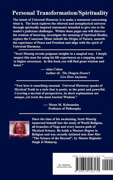 The intent of Universal Harmony is to make a statement of what IS. The book explores the Ethereal and Metaphysical Universe through spiritually inspired statements intended to give rise to the reader's judicious challenges. Within these pages one will discover the wisdom of knowing, investigate the meaning of Spiritual Reality, explore the Conscious Mind, behold the origin of nature, unearth the experience of Peace and Freedom and align with the spirit of Universal Harmony.