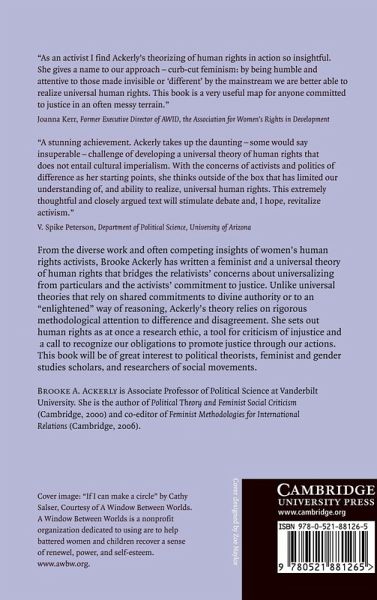 From the diverse work and often competing insights of women's human rights activists, Brooke Ackerly has written a feminist and a universal theory of human rights that bridges the relativists' concerns about universalizing from particulars and the activists' commitment to justice. Unlike universal theories that rely on shared commitments to divine authority or to an 'enlightened' way of reasoning, Ackerly's theory relies on rigorous methodological attention to difference and disagreement. She sets out human rights as at once a research ethic, a tool for criticism of injustice and a call to recognize our obligations to promote justice through our actions. This book will be of great interest to political theorists, feminist and gender studies scholars and researchers of social movements.