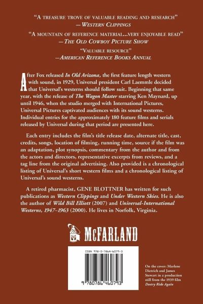 After Fox released In Old Arizona, the first feature length western with sound, in 1929, Universal president Carl Laemmle decided that Universal's westerns should follow suit. Beginning that same year, with the release of The Wagon Master starring Ken Maynard, up until 1946, when the studio merged with International Pictures, Universal Pictures captivated audiences with its sound westerns. Individual entries for the approximately 180 feature films and serials released by Universal during that period are presented here. Each entry includes the film's title release date, alternate title, cast, credits, songs, location of filming, running time, source if the film was an adaptation, plot synopsis, commentary from the author and from the actors and directors, representative excerpts from reviews, and a tag line from the original advertising. Also provided is a chronological listing of Universal's short western films and a chronological listing of Universal's sound westerns.