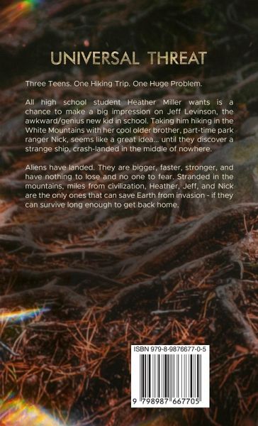 Three Teens. One Hiking Trip. One Huge Problem. All high school student Heather Miller wants is a chance to make a big impression on Jeff Levinson, the awkward/genius new kid in school. Taking him hiking in the White Mountains with her cool older brother, part-time park ranger Nick, seems like a great idea... until they discover a strange ship, crash-landed in the middle of nowhere. Aliens have landed. They are bigger, faster, stronger, and have nothing to lose and no one to fear. Stranded in the mountains, miles from civilization, Heather, Jeff, and Nick are the only ones that can save Earth from invasion - if they can survive long enough to get back home. 'Universal Threat' is a nostalgic sci-fi adventure set in the 1980s, written by and for Twilight Zone fans. Best read outdoors by campfire.