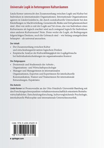 Linda Kerner untersucht den Zusammenhang zwischen Logik und Kultur bei Individuen in internationalen Organisationen. Internationale Organisationen agieren in Länder(märkte)n, die durch soziokulturelle Unterschiede bei den Einstellungen zu Machtverteilung, Gemeinwohl, Risiko und Zeit gekennzeichnet sind. Aber wie sieht es mit der Logik aus? Ist etwas, das von Individuen eines Kulturraums als logisch erachtet wird auch zwingend logisch für Individuen eines anderen Kulturraums? Nein. Denn weder die Logik, als Bedingungen folgerichtigen Denkens, noch ihr Gebrauch sind - wie bislang unangefochten behauptet - als universal anzusehen.