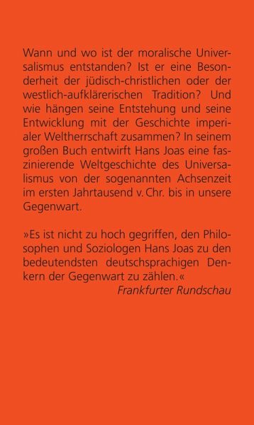 Von der sogenannten »Achsenzeit« ausgehend, zeichnet er dessen Entstehung in der griechischen Antike, in Judentum und Christentum, in Indien und China nach und betrachtet es im Zusammenhang mit imperialen Reichsbildungen bis hin zum Kolonialismus, Faschismus und Kommunismus. Kann es einen Universalismus ohne Imperialismus überhaupt geben? Und wie steht der Islam zu den achsenzeitlichen Entwürfen einesMenschheitsethos? Joas' Antworten auf diese großen Fragen fügen sich zu einem Opus Magnum, mit dem er seine vielbeachteten Arbeiten zur Geschichte von Religion und politischer Macht krönt.