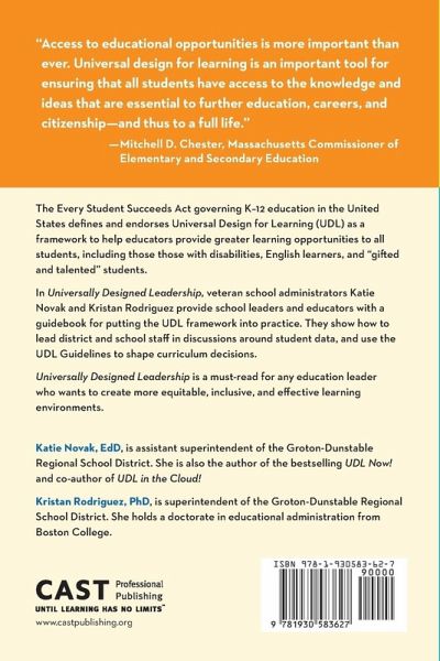 The Every Student Succeeds Act governing K–12 education in the United States defines and endorses Universal Design for Learning (UDL) as a framework to help educators provide greater learning opportunities to all students, including those those with disabilities, English learners, and "gifted and talented" students. In Universally Designed Leadership, veteran school administrators Katie Novak and Kristan Rodriguez provide school leaders and educators with a guidebook for putting the UDL framework into practice. They show how to lead district and school staff in discussions around student data, and use the UDL Guidelines to shape curriculum decisions. Universally Designed Leadership is a must-read for any education leader who wants to create more equitable, inclusive, and effective learning environments.