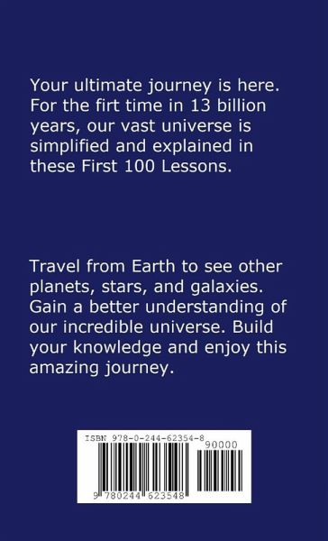 Your ultimate journey is here! Travel from Earth to visit other planets, stars, and galaxies. The universal tour takes you to the most distant galaxy yet located in our vast universe. For the first time in 13 billion years, our universe is simplified and explained in these First 100 Lessons. Gain a better understanding of our incredible universe. Build your knowledge and enjoy this amazing journey.