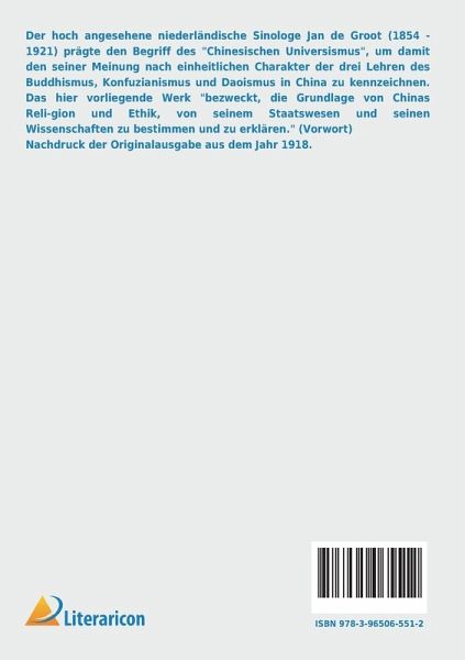 Der hoch angesehene niederländische Sinologe Jan de Groot (1854 - 1921) prägte den Begriff des "Chinesischen Universismus", um damit den seiner Meinung nach einheitlichen Charakter der drei Lehren des Buddhismus, Konfuzianismus und Daoismus in China zu kennzeichnen. Das hier vorliegende Werk "bezweckt, die Grundlage von Chinas Religion und Ethik, von seinem Staatswesen und seinen Wissenschaften zu bestimmen und zu erklären." (Vorwort) Nachdruck der Originalausgabe aus dem Jahr 1918.