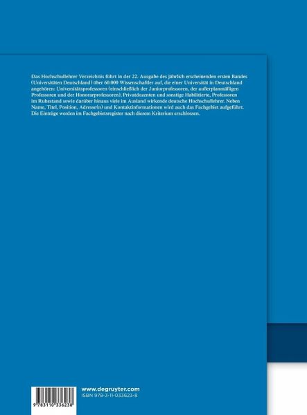 This directory covers in its 22nd edition about 60,000 members of academic staff holding the title of Professor at German universities. Details provided include name, title, position held, address(es), contact details as well as the field(s) of activity. The index lists academics alphabetically according to fields of activity.