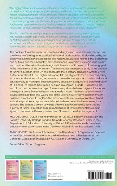 This book explores the impact of localities and regions on universities and shows how the diversity of the higher education landscape is critically affected by the geophysical character of regions and their differentiated economies and cultures; regional inequalities bear heavily on universities' strategy-making. A study of the interrelationship between higher and further education argues that from a regional perspective a change to a tertiary education system in England (following Wales) would create the conditions for better local and regional coordination. Universities make a significant contribution to 'levelling up' through technology transfer and the creation of innovation hubs but the contribution of locally or regionally based students who on graduation return to disadvantaged communities rather than seek employment elsewhere should be recognised also as a longer term step to redressing regional inequality. The book argues strongly that the time has come to decentralise the governance of a re-aligned tertiary system to regions and identifies the move to create metro mayors and combined authorities as providing the appropriate vehicle to release new initiative from regional sources. It cites the success of decentralisation to Scotland and Wales as offering relevant models for scrutiny. The authors draw on 12 UK widely differentiated university case studies, a survey of further education and a study of three continental European comparators (Germany, Ireland and Norway) to develop the argument.