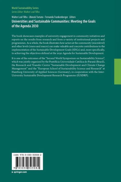The book showcases examples of university engagement in community initiatives and reports on the results from research and from a variety of institutional projects and programmes. As a whole, the book illustrates how actors at the community (microlevel) and other levels (meso and macro) can make valuable and concrete contributions to the implementation of the Sustainable Development Goals (SDGs) and, more specifically, to achieving the objectives defined at the 2030 Agenda for Sustainable Development.