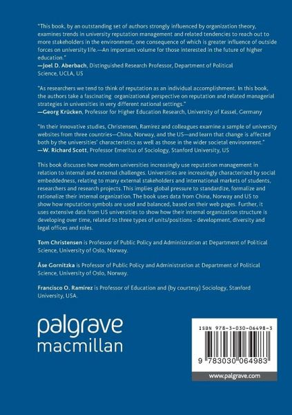 This book discusses how modern universities increasingly use reputation management in relation to internal and external challenges. Universities are increasingly characterized by social embeddedness, relating to many external stakeholders and international markets of students, researchers and research projects. This implies global pressure to standardize, formalize and rationalize their internal organization. The book uses data from China, Norway and US to show how reputation symbols are used and balanced, based on their web pages. Further, it uses extensive data from US universities to show how their internal organization structure is developing over time, related to three types of units/positions - development, diversity and legal offices and roles.