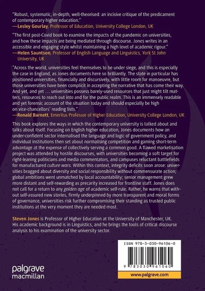 This book explores the ways in which the contemporary university is talked about, and talks about itself. Focusing on English higher education, Jones documents how an under-confident sector internalised the language and logic of government policy, and individual institutions then set about normalising competition and gaming short-term advantage at the expense of collectively serving a common good. A flawed marketisation project was attended and sustained by hostile discourses, with purportedly woke universities becoming a soft target for right-leaning politicians and media commentators, and campuses reluctant battlefields for manufactured culture wars. Within this context, integrity deficits soon arose: universities bragged about diversity and social responsibility without commensurate action; global ambitions went unmatched by local accountability; senior management grew more distant and self-rewarding as contractual precarity increased for frontline staff. Jones does not call for a return to any golden age of academic self-rule. Rather, he warns that without self-assured new stories, firmly underpinned by more transparent and moral forms of governance, universities risk further compromising their standing as trusted public institutions at the very moment they are needed most.