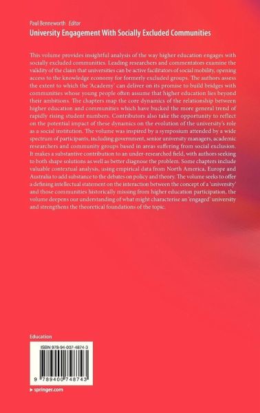 This volume provides insightful analysis of the way higher education engages with socially excluded communities. Leading researchers and commentators examine the validity of the claim that universities can be active facilitators of social mobility, opening access to the knowledge economy for formerly excluded groups. The authors assess the extent to which the 'Academy' can deliver on its promise to build bridges with communities whose young people often assume that higher education lies beyond their ambitions. The chapters map the core dynamics of the relationship between higher education and communities which have bucked the more general trend of rapidly rising student numbers. Contributors also take the opportunity to reflect on the potential impact of these dynamics on the evolution of the university's role as a social institution. The volume was inspired by a symposium attended by a wide spectrum of participants, including government, senior university managers, academic researchers and community groups based in areas suffering from social exclusion. It makes a substantive contribution to an under-researched field, with authors seeking to both shape solutions as well as better diagnose the problem. Some chapters include valuable contextual analysis, using empirical data from North America, Europe and Australia to add substance to the debates on policy and theory. The volume seeks to offer a defining intellectual statement on the interaction between the concept of a 'university' and those communities historically missing from higher education participation, the volume deepens our understanding of what might characterise an 'engaged' university and strengthens the theoretical foundations of the topic.