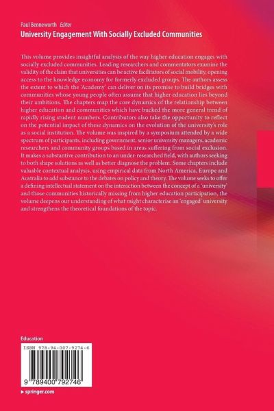 This volume provides insightful analysis of the way higher education engages with socially excluded communities. Leading researchers and commentators examine the validity of the claim that universities can be active facilitators of social mobility, opening access to the knowledge economy for formerly excluded groups. The authors assess the extent to which the 'Academy' can deliver on its promise to build bridges with communities whose young people often assume that higher education lies beyond their ambitions. The chapters map the core dynamics of the relationship between higher education and communities which have bucked the more general trend of rapidly rising student numbers. Contributors also take the opportunity to reflect on the potential impact of these dynamics on the evolution of the university's role as a social institution. The volume was inspired by a symposium attended by a wide spectrum of participants, including government, senior university managers, academic researchers and community groups based in areas suffering from social exclusion. It makes a substantive contribution to an under-researched field, with authors seeking to both shape solutions as well as better diagnose the problem. Some chapters include valuable contextual analysis, using empirical data from North America, Europe and Australia to add substance to the debates on policy and theory. The volume seeks to offer a defining intellectual statement on the interaction between the concept of a 'university' and those communities historically missing from higher education participation, the volume deepens our understanding of what might characterise an 'engaged' university and strengthens the theoretical foundations of the topic.