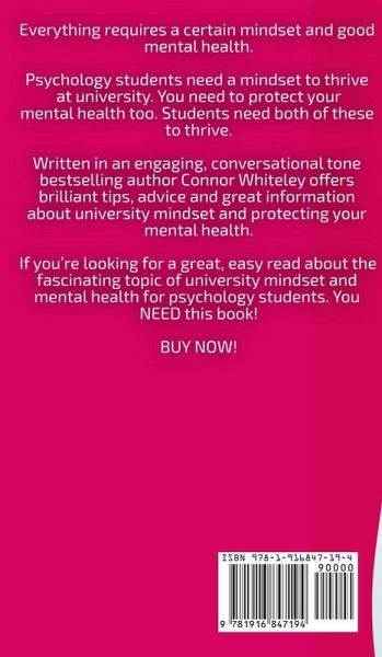 Everything requires a certain mindset and good mental health. Psychology students need a mindset to thrive at university. You need to protect your mental health too. Students need both of these to thrive. Written in an engaging, conversational tone bestselling author Connor Whiteley offers brilliant tips, advice and great information about university mindset and protecting your mental health. If you're looking for a great, easy read about the fascinating topic of university mindset and mental health for psychology students. You NEED this book! BUY NOW! University Mental Health and Mindset Includes Introduction Part One: Mental Health How To Maintain Mental Health For University Students? How To Find Mental Health Support Services At University? How To Prevent Loneliness At University? How To overcome Imposter Syndrome? How To Keep Yourself Happy During learning At University? The Importance Of Feeling Good and Self-satisfaction In Learning How To Deal With Stress And Anxiety When Waiting For Exam Marks? Why Is Talking So Powerful So University Students? Part Two: The University Mindset The University Mindset The Learning University Mindset What Is The Improvement University Mindset? The University Mindset And Reading Conclusion