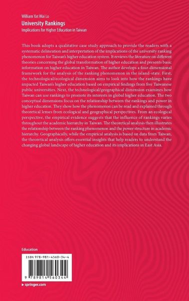 This book adopts a qualitative case study approach to provide the readers with a systematic delineation and interpretation of the implications of the university ranking phenomenon for Taiwan's higher education system. It reviews the literature on different theories concerning the global transformation of higher education and presents basic information on higher education in Taiwan. The author develops a four-dimensional framework for the analysis of the ranking phenomenon in the island-state. First, the technological/ecological dimension aims to look into how the rankings have impacted Taiwan's higher education based on empirical findings from five Taiwanese public universities. Next, the technological/geographical dimension examines how Taiwan can use rankings to promote its interests in global higher education. The two conceptual dimensions focus on the relationship between the rankings and power in higher education. They show how the phenomenon can be read and explained through theoretical lenses from ecological and geographical perspectives. From an ecological perspective, the empirical evidence suggests that the influence of rankings varies throughout the academic hierarchy in Taiwan. The theoretical analysis then illustrates the relationship between the ranking phenomenon and the power structure in academic hierarchy. Geographically, while the empirical analysis is based on data from Taiwan, the theoretical analysis offers essential insights that help readers to understand the changing global landscape of higher education and its implications in East Asia.
