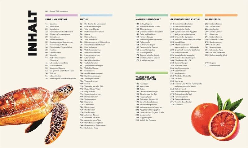 Die 88 Sternbilder, die 36 Morsezeichen, die 118 chemischen Elemente und die 206 Knochen des menschlichen Körpers - so ordnen wir die Welt, verstehen sie und verleihen ihr Sinn. Egal ob im Bereich Natur, Wissenschaft und Forschung, im Kommunikationswesen oder in Geschichte und Kultur, dieses umfangreiche Kompendium für Kinder ab 9 Jahren (und Erwachsene) gibt einen umfassenden Überblick über das aktuelle Wissen der Menschheit. Über 6.000 Abbildungen und einführende Texte erklären unfassbar vielseitige Themen, vom Alltäglichen bis zum Unbekannten, wir lernen über Wirbeltiere, Krankheiten, Käsesorten & Co. So ist das Buch Nachschlagewerk und Inspirationsquelle zugleich und unverzichtbar für alle, die sich für die vielen Facetten unserer Welt interessieren.