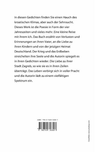 In diesen Gedichten finden Sie einen Hauch des kroatischen Klimas, aber auch der Sehnsucht. Dieses Werk ist die Poesie in Form der vier Jahreszeiten und vieles mehr. Eine kleine Reise mit ihrem Ich. Das Buch erzählt von Verlusten und Erinnerungen an ihren Vater, an die Liebe zu ihren Kindern und von der jetzigen Heimat Deutschland. Der Krieg und das Erdbeben streichelten ihre Seele und die Autorin spiegelt es in ihren Gedichten wieder. Die Liebe zu ihrer Stadt Zagreb, so wie sie es in ihren Zeilen überträgt. Das Leben verbirgt sich in voller Pracht und die Autorin lädt zu einem vielfältigen Spektrum ein.