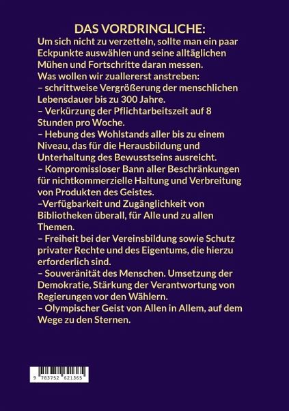 Vor dem Einschlafen erzählt man dem Kind eine möglichst ungetrübte Geschichte. Möge der Schatz unbeschwert ruhen und etwas Schönes träumen. Die Erzählung muss nicht simpel sein, darf ruhig nachdenklich stimmen, aber ihre Wendungen sollten stets gut enden. Meine Abhandlung bezweckt das Gleiche für alle Menschenkinder und in jedem Alter. Es ist eine Gute-Nacht-Geschichte für diejenigen, die nicht wissen, was der morgige Tag bringen wird. Sie ist festgehalten in kurzen Fragen und Antworten zu Themen, die wir gewöhnlich für selbstverständlich halten, ohne dass sie es im Geringsten sind. Das sprunghafte Wechselspiel der Darstellung provoziert zuweilen, aber nur, um auf die bestehenden Widersprüche unserer Auffassungen hinzuweisen. Jede Frage bietet Anlass, sich aus dem Alltäglichen auszuklinken und das Gewohnte aus einem anderen Blickwinkel zu betrachten. Jede Antwort bringt Hoffnung und Neugierde auf weitere Fortsetzungen. Der Inhalt ist systematisch in drei Abschnitte eingeteilt. Die SchöpfungDie Gabe undDas BekenntnisDas letzte Buch fasst das Wesentliche der ersten beiden Bücher zusammen, ohne auf die Einzelheiten von Physik, Biologie und Kultur einzugehen. Das Bekenntnis geht schnurgerade zum wichtigsten Thema der Trilogie dem menschlichen Geist über, betrachtet seine Entstehung, Gegenwart und ferne Zukunft. Die allzu Ungeduldigen können gleich damit beginnen, werden dort aber keine ausführlichen Erklärungen finden.