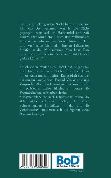 "In der zurückliegenden Nacht hatte er um zwei Uhr das Bett verlassen, war in die Küche gegangen, hatte sich ein Bier aus dem Kühlschrank geholt und sich im Halbdunkel aufs Sofa gesetzt. Der Mond stand hoch und vollrund am Himmel, er erhellte den Garten hinterm Haus und warf kaltes Licht als breiten kalkweißen Streifen in das Wohnzimmer. Kein Laut. Eine Stille, die er, so empfand er es, hätte mit Händen greifen können."Durch einen mysteriösen Unfall hat Edgar Frau und Tochter verloren. Seither findet er keine innere Ruhe mehr, Nächte sind ihm ein Graus. In seiner Ratlosigkeit versucht er, bei seinem langjährigen Freund Verständnis und Zuspruch zu finden. Aber das Leben seines Freundes hat mittlerweile einen Weg eingeschlagen, der diesen immer tiefer in politische Kreise hineinzieht, an denen die Freundschaft zu zerbrechen droht.Selbstzweifel, Suche nach Lebenssinn, Träume, die sich nicht erfüllen, Liebe, die einen Scherbenhaufen hinterlässt - das sind die Gefühlswelten, in denen sich die Figuren dieses Romans bewegen.