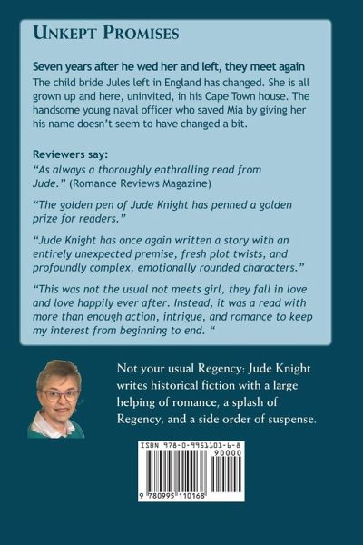 She wants to negotiate a comfortable marriage; he wants her in his bed Naval captain Jules Redepenning has spent his adult life away from England, and at war. He rarely thinks of the bride he married for her own protection, and if he does, he remembers the child he left after their wedding seven years ago. He doesn’t expect to find her in his Cape Town home, a woman grown and a lovely one, too. Mia Redepenning sails to Cape Town to nurse her husband’s dying mistress and adopt his children. She hopes to negotiate a comfortable married life with the man while she’s there. Falling in love is not on her to-do list. Before they can do more than glimpse a possible future together, their duties force them apart. At home in England, Mia must fight for the safety of Jules's children. Imprisoned in France, Jules must battle for his self-respect and his life. Only by vanquishing their foes can they start to make their dreams come true. Not your usual Regency: Jude Knight writes historical fiction with a large helping of romance, a splash of Regency, and a side order of suspense.
