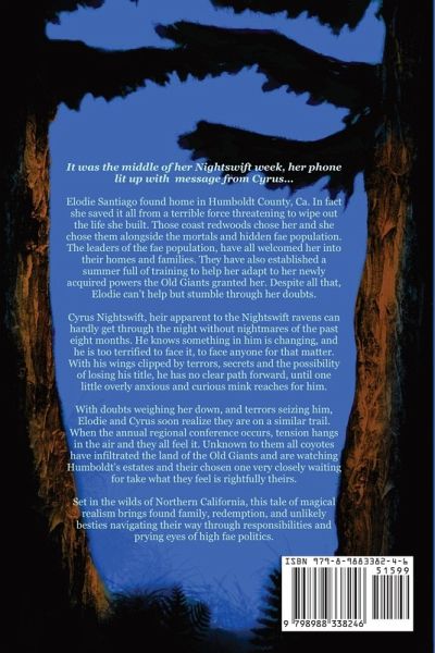 It was the middle of her Nightswift week, her phone lit up with a message from Cyrus... Elodie Santiago found home in Humboldt County, Ca. In fact she saved it all from a terrible force threatening to wipe out the life she built. Those coast redwoods chose her and she chose them alongside the mortals and hidden fae population. The leaders of the fae population, Lord Greenthistle, Lord Nightswift, and Lord Ashdale have all welcomed her into their homes and families. They have also established a summer full of training to help her adapt to her newly acquired powers the Old Giants granted her. Despite all that, Elodie can't help but stumble through her doubts. Cyrus Nightswift, heir apparent to the Nightswift ravens can hardly get through the night without nightmares of the past eight months. He knows something in him is changing, and he is too terrified to face it, to face anyone for that matter. With his wings clipped by terrors, secrets and the possibility of losing his title, he has no clear path forward, until one little overly anxious and curious mink reaches for him. With doubts weighing her down, and terrors seizing him, Elodie and Cyrus soon realize they are on a similar trail. When the annual regional conference occurs, tension hangs in the air and they all feel it. Unknown to them all coyotes have infiltrated the land of the Old Giants and are watching Humboldt's estates and their chosen one very closely waiting for take what they feel is rightfully theirs. Set in the wilds of Northern California, this tale of magical realism brings found family, redemption, and unlikely besties navigating their way through responsibilities and prying eyes of high fae politics. Author's Note: This book is the second in contemporary eco-fantasy trilogy. It includes heavy topics intended for a mature audience including episodes of PTSD, anxiety, and other themes that may not be suitable for sensitive or younger readers.