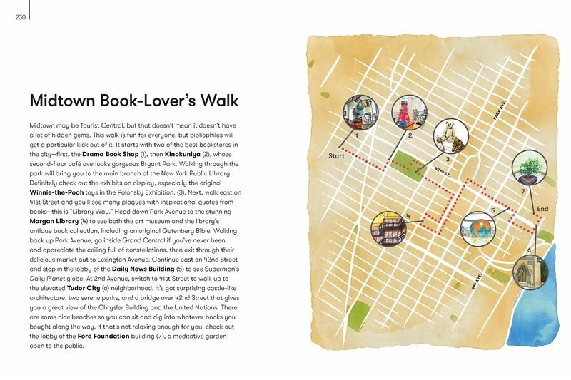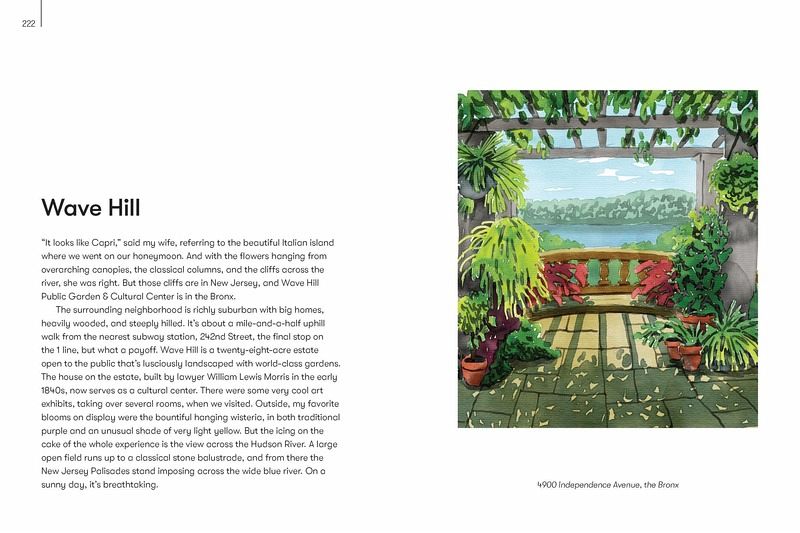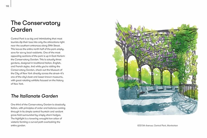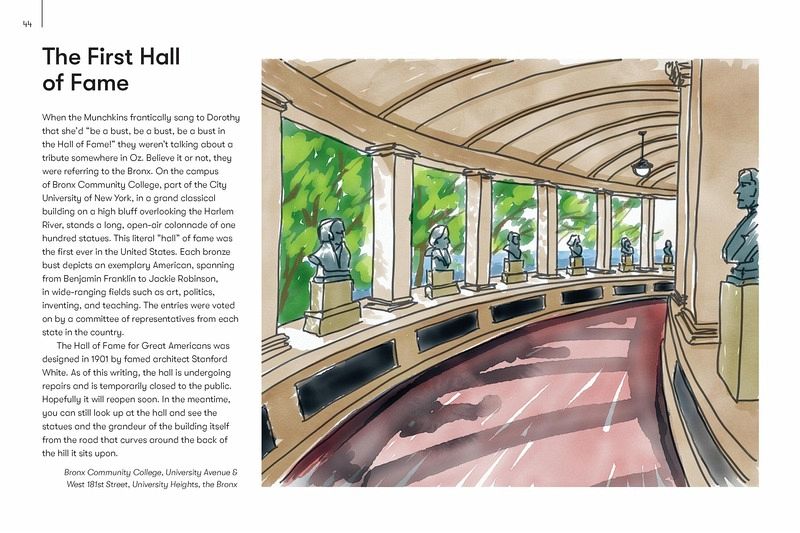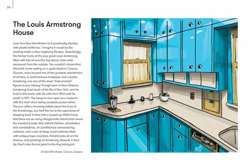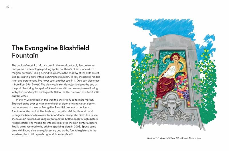 Hidden History – Includes the location of a little-known cottage that links Edgar Allen Poe to the creation of Batman. Central Park – Spotlights bridges and tucked away green spots, as well as stories behind many of the myriad statues Humble Parks – here are more than 1,000 parks across NYC’s boroughs, and this chapter showcases the smaller and more charming of those. On the Street – Includes the location of a single short block that hosts a dozen weird styles of architecture as well as several notable pieces of art Shopping Spree – Includes specialty stores with extraordinary wares, like the Superhero Supply Store; or ones with an attraction, like a bookstore with a gold and blue ceiling painted with stars, constellations, planets and the symbols of the zodiac. Quiet Realms – Both visitors and inhabitants will find places of refuge in this chapter, including an art installation consisting of a huge space filled with dirt. Excursions – Take a longer subway ride or car out to Louis Armstrong’s house, with its turquoise blue kitchen (including appliances!) or Wave Hill, with its Capri-like setting along the Hudson.