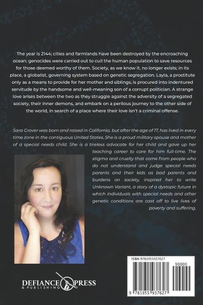 In the year 2144, rising seas have devoured cities and farmlands, while genetic segregation has torn humanity apart. In this haunting vision of the future, those deemed "genetically unworthy" are condemned to lives of poverty and exploitation, while the privileged few enjoy the comforts of a carefully controlled society. Layla, forced into prostitution to support her struggling family, finds her life unexpectedly intertwined with Marcus, the idealistic son of a powerful politician. When he offers her a position in his household to save her from the streets, neither expects the forbidden connection that blooms between them. But in a world where genetic purity dictates social status, their growing love isn't just taboo-it's a crime punishable by death. As Layla and Marcus navigate the treacherous waters of their attraction, they uncover disturbing truths about the system that defines their world. Their journey takes them across a transformed Earth in search of a rumored sanctuary where love isn't determined by genetic code. But with government forces in pursuit and their own demons to face, survival will require more than just escape-it will demand they confront a society that would rather see them dead than together. "Unknown Variant" is a gripping dystopian romance that explores the timeless themes of discrimination, sacrifice, and the courage to love against all odds. This powerful debut novel challenges readers to question the true meaning of human worth in a world where genetics determine destiny. Author Bio >Grover's debut novel, "Unknown Variant," was born from her fierce advocacy for neurodiversity and her determination to confront the stigmas faced by those deemed "different." Through her writing, she transforms real-world prejudices into compelling dystopian fiction that forces readers to examine their own biases. When not writing, she dedicates her time to raising awareness about special needs acceptance and supporting military families facing similar challenges.