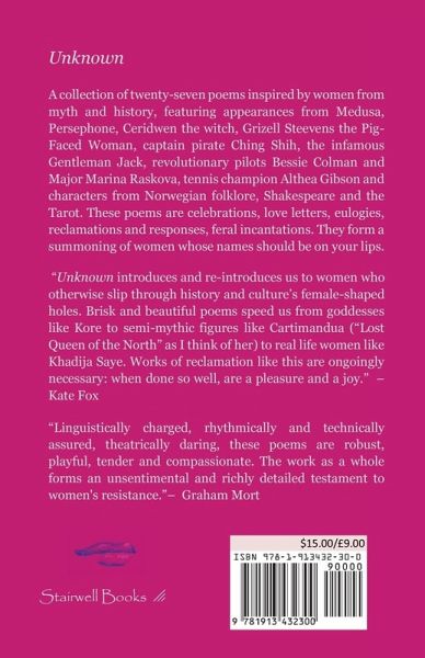 "Linguistically charged, rhythmically and technically assured, theatrically daring, this poetry collection restores mythical and historical female figures to the human imagination. The cast of characters includes Greek goddesses, an 18th Century Chines pirate, pilots in the WWII Serbian Night Bomber Regiment, black American golf and tennis pro, Althea Gibson, and photographer Khadija Saye, who died in the Grenfell fire. The poems are robust, playful, tender and compassionate. The work as a whole forms an unsentimental and richly detailed testament to women's resistance. It bears witness, expressing and celebrating the life-force and capacity for love that defines each character and that we recognise as poetry's authentic subject matter." Graham Mort "Unknown cracks on with its task of introducing and re-introducing us to women who might otherwise slip through history and culture's ever wide female-shaped holes. Brisk and beautiful poems speed us from goddesses like Kore to semi-mythic figures like Cartimandua ("Lost Queen of the North" as I think of her) to real life women like Khadija Saye, a young artist who tragically died in the Grenfell fire. Works of reclamation like this are ongoingly necessary-which is frustrating-but when they're done so well, are a pleasure and a joy." Kate Fox