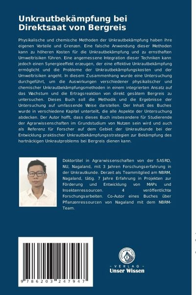 Physikalische und chemische Methoden der Unkrautbekämpfung haben ihre eigenen Vorteile und Grenzen. Eine falsche Anwendung dieser Methoden kann zu höheren Kosten für die Unkrautbekämpfung und zu ernsthaften Umweltrisiken führen. Eine angemessene Integration dieser Techniken kann jedoch einen Synergieeffekt erzeugen, der eine effektive Unkrautbekämpfung ermöglicht und die Probleme der Unkrautbekämpfungskosten und der Umweltrisiken angeht. In diesem Zusammenhang wurde eine Untersuchung durchgeführt, um die Auswirkungen verschiedener physikalischer und chemischer Unkrautbekämpfungsmethoden in einem integrierten Ansatz auf das Wachstum und die Ertragsreaktion von direkt gesätem Bergreis zu untersuchen. Dieses Buch soll die Methodik und die Ergebnisse der Untersuchung auf umfassende Weise darstellen. Der Inhalt des Buches wurde in verschiedene Kapitel unterteilt, die alle Aspekte der Untersuchung abdecken. Der Autor hofft, dass dieses Buch insbesondere für Studierende der Agrarwissenschaften im Grundstudium von Nutzen sein wird und auch als Referenz für Forscher auf dem Gebiet der Unkrautkunde bei der Entwicklung praktischer Unkrautbekämpfungsstrategien zur Bekämpfung des hartnäckigen Unkrautproblems bei Bergreis dienen kann.