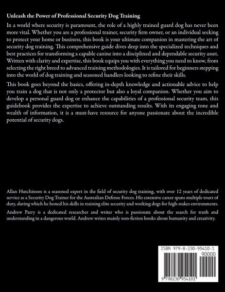Unleash the Power of Professional Security Dog Training In a world where security is paramount, the role of a highly trained guard dog has never been more vital. Whether you are a professional trainer, security firm owner, or an individual seeking to protect your home or business, this book is your ultimate companion in mastering the art of security dog training. This comprehensive guide dives deep into the specialized techniques and best practices for transforming a capable canine into a disciplined and dependable security asset. Written with clarity and expertise, this book equips you with everything you need to know, from selecting the right breed to advanced training methodologies. It is tailored for beginners stepping into the world of dog training and seasoned handlers looking to refine their skills. This book goes beyond the basics, offering in-depth knowledge and actionable advice to help you train a dog that is not only a protector but also a loyal companion. Whether you aim to develop a personal guard dog or enhance the capabilities of a professional security team, this guidebook provides the expertise to achieve outstanding results. With its engaging tone and wealth of information, it is a must-have resource for anyone passionate about the incredible potential of security dogs.