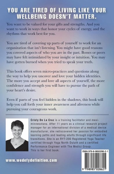 You are tired of living like your wellbeing doesn't matter. You want to be valued for your gifts and strengths. And you want to work in ways that honor your cycles of energy, and the rhythms that work best for you. You are tired of covering up parts of yourself to work for an organization that isn't listening. You might have good reasons you covered aspects of who you are in the past. Bosses or peers may have felt intimidated by your insight or intuition. You may have gotten burned when you tried to speak your truth. This book offers seven micro-practices and questions along the way to help you uncover and love your hidden identities. The more you accept and love all aspects of yourself, the more confidence and strength you will have to pursue the path of your heart's desire. Even if parts of you feel hidden in the shadows, this book will help you call forth your inner awareness and aliveness while pursuing your courageous work.