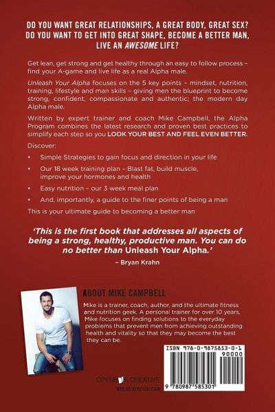 Do you want great relationships, a great body, great sex? Do you want to get into great shape, become a better man, live an awesome life? Get lean, get strong, get healthy through an easy to follow process - find your A-game and live life as an Alpha male. Unleash Your Alpha focuses on the 5 key points - mindset, nutrition, training, lifestyle and man skills - giving men the blueprint to become strong, confident, compassionate, and authentic; the modern day Alpha male. Written by expert trainer and coach Mike Campbell, the Alpha Program combines the latest research and proven best practices to simplify each step so you LOOK YOUR BEST, FEEL EVEN BETTER. DISCOVER: Simple Strategies to gain focus and direction in your life Our 18 week training plan - Blast fat, build muscle, improve your hormones and health Easy nutrition - our 3 week meal plan And, importantly, a guide to the finer points of being a man This is your ultimate guide to becoming a better man ABOUT THE AUTHOR: Mike is a trainer, coach, author, and the ultimate fitness and nutrition geek. A personal trainer for over 10 years, Mike focuses on finding solutions to the everyday problems that prevent men from achieving outstanding health and vitality so that they may become the best they can be.