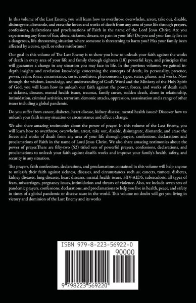 In this volume of the Last Enemy, you will learn how to overthrow, overwhelm, arrest, take out, disable, disintegrate, dismantle, and erase the forces and works of death from any area of your life through prayers, confessions, declarations and proclamations of Faith in the name of the Lord Jesus Christ. Are you experiencing any form of fear, abuse, sickness, disease, or pain in your life? Do you and your family live in a dangerous, life-threatening situation where someone is threatening to harm you? Has your family been affected by a curse, spell, or other misfortune? Our goal in this volume of The Last Enemy is to show you how to unleash your faith against the works of death in every area of your life and family through eighteen (18) powerful keys, and principles that will guarantee a change in any situation you may face in life. In the previous volumes, we gained in-depth insights and revelation knowledge concerning the concepts of death; its personality, presence, power, realm, force, circumstance, curse, condition, phenomenon, types, states, phases, and works. Now through the wisdom, knowledge, and understanding of God's Word and the Ministry of the Holy Spirit of God, you will learn how to unleash our faith against the power, forces, and works of death such as sickness, diseases, mental health issues, traumas, family curses, sudden death, abuse in relationship, intimidation, criminal activities, terrorism, demonic attacks, oppression, assassination and a range of other issues including a global pandemic. Do you suffer from cancer, diabetes, heart disease, kidney disease, mental health issues? Discover how to unleash your faith in any situation or circumstance and effect a change. We also share amazing testimonies about the power of prayer. In this volume of the Last Enemy, you will learn how to overthrow, overwhelm, arrest, take out, disable, disintegrate, dismantle, and erase the forces and works of death from any area of your life through prayers, confessions, declarations and proclamations of Faith in the name of Lord Jesus Christ. We also share amazing testimonies about the power of prayer.There are fifty-two (52) titled sets of powerful prayers, confessions, declarations, and proclamations to unleash your faith against death's works and improve your family's health, safety, and security in any situation. The prayers, faith confessions, declarations, and proclamations contained in this volume will help anyone to unleash their faith against sickness, diseases, and circumstances such as; cancers, tumors, diabetes, kidney diseases, lung diseases, heart diseases, mental health issues, HIV-AIDS, tuberculosis, all types of fears, miscarriages, pregnancy issues, intimidation and threats of violence. Also, we include seven sets of pandemic prayers, confessions, declarations, and proclamations to help you live in health, peace, and safety in times of a global pandemic or disease scare in the world. This volume no doubt will get you living in victory and dominion of the Last Enemy and its works