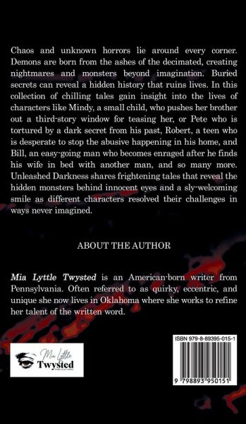 Chaos and unknown horrors lie around every corner. Demons are born from the ashes of the decimated, creating nightmares and monsters beyond imagination. Buried secrets can reveal a hidden history that ruins lives.In this collection of chilling tales gain insight into he lives of characters like Mindy, a small child, who pushes her brother out a third-story window for teasing her, or Pete who is tortured by a dark secret from his past, Robert, a teen who is desperate to stop the abusive happening in his home, and Bill, an easy going man who becomes enraged after he finds his wife in bed with another man, and so many more.Unleashed Darkness shares frightening tales that reveal the hidden monsters behind innocent eyes and a sly-welcoming smile as different characters resolved their challenges in ways never imagined.