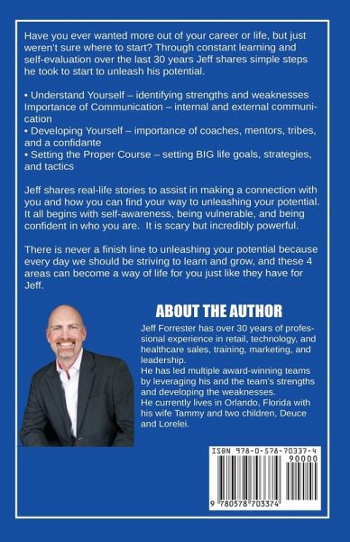 Have you ever wanted more out of your career or life, but just weren't sure where to start? Through constant learning and self-evaluation over the last 30 years Jeff shares simple steps he took to start to unleash his potential. Inside, you will discover powerful, yet simple steps to becoming the best version of you, like: * Understand Yourself - identifying strengths and weaknesses * Importance of Communication - internal and external communication * Developing Yourself - importance of coaches, mentors, tribes, and a confidante * Setting the Proper Course - setting BIG life goals, strategies, and tactics Jeff shares real-life stories to assist in making a connection with you and how you can find your way to unleashing your potential. It all begins with self-awareness, being vulnerable, and being confident in who you are. It is scary but incredibly powerful. The next step to unleashing your potential revolves around how you speak to yourself and others. How you communicate with yourself is often overlooked and changing how you speak to yourself internally and externally will impact your life.Third step is the importance of not delegating your professional and personal development to other people but being the driving force behind it. Self-learning is not the only critical aspect in development but also taking advantage of coaches, mentors, tribes, and a confidante. The fourth and final step is setting the proper course. You will hear specifics on setting BIG goals and the importance of setting proper strategies, and tactics to accomplish more than you have in the past. There is never a finish line to unleashing your potential because every day we should be striving to learn and grow, and these 4 areas can become a way of life for you just like they have for Jeff.