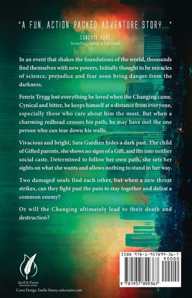 In an event that shakes the foundations of the world, thousands find themselves with new powers. Initially thought to be miracles of science, prejudice and fear soon bring danger from the darkness. Fenris Trygg lost everything he loved when the Changing came. Cynical and bitter, he keeps himself at a distance from everyone, especially those who care about him the most. But when a charming redhead crosses his path, he may have met the one person who can tear down his walls. Vivacious and bright, Sara Gardien hides a dark past. The child of Gifted parents, she shows no signs of a Gift, and fits into neither social caste. Determined to follow her own path, she sets her sights on what she wants and allows nothing to stand in her way. Two damaged souls find each other, but when a new threat strikes, can they fight past the pain to stay together and defeat a common enemy? Or will the Changing ultimately lead to their death and destruction?