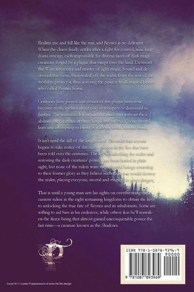 An epic tale of greed, lust, and the need for power. Realms rise and fall like the sun, and Reynes is no different. When the chaos finally settles after a fight for control, nine kingdoms emerge, each responsible for diverse races of dark magic creatures forged by a plague that swept over the land. Dermont the Wise, a sorcerer and master of light magic, bound and destroyed this curse, then sealed off the realm from the rest of the world to protect it, thus severing the powers to all magical beings who called Reynes home. Centuries have passed and stories of the plague have now become myth, spoken about only in whispers or dismissed as fantasy. The remnants left behind still exist, but without their abilities the creatures in these kingdoms are stuck living mortal lives and attempting to blend in with the world around them. It isn't until the fall of the kingdom of Drouviel that anyone begins to take notice of the truths hidden in the lies that have been told over the centuries. The key to unlocking the realm and restoring the dark creatures' powers has been buried in plain sight, but none of the rulers want these horrid beings returning to their former glory as they believe such an action would destroy the realm, placing everyone, mortal and magical, in grave danger. That is until a young man sets his sights on overthrowing the current rulers in the eight remaining kingdoms to obtain the keys to unlocking the true fate of Reynes and its inhabitants. Some are willing to aid him in his endeavor, while others fear he'll reawaken the fierce being that almost gained unconquerable power the last time-a creature known as the Shadows.