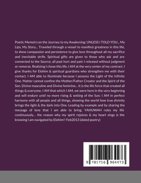 Timika Nicole Kelly Unless I Told You/ Empress Timika NatanYah Poetic Journeys through the Mind to my Awakening Book Design by: Kalik El Zodiak voiceoftheuniverse.org / Editor: Timika Kelly /With suggestions by: He Ruler of supremedesignonline.com. Photographs are personal images either taken by self, family, friends, professional photographers or romantic partner. Images downloaded from world wide web & personal social media accounts. (Timika N Kelly & Timika Kelly & Aleph_Apothecary on FB / InnerJoy214 & Aleph_Apothecary on IG) Visit www.AlephApothecary.com