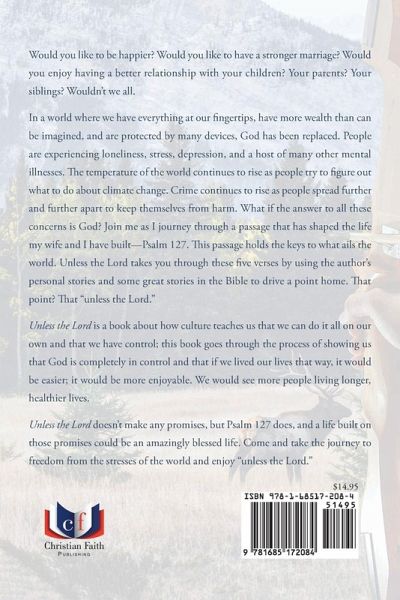 Would you like to be happier? Would you like to have a stronger marriage? Would you enjoy having a better relationship with your children? Your parents? Your siblings? Wouldn't we all. In a world where we have everything at our fingertips, have more wealth than can be imagined, and are protected by many devices, God has been replaced. People are experiencing loneliness, stress, depression, and a host of many other mental illnesses. The temperature of the world continues to rise as people try to figure out what to do about climate change. Crime continues to rise as people spread further and further apart to keep themselves from harm. What if the answer to all these concerns is God? Join me as I journey through a passage that has shaped the life my wife and I have built--Psalm 127. This passage holds the keys to what ails the world unless the Lord takes you through these five verses by using the author's personal stories and some great stories in the Bible to drive a point home. That point? That "unless the Lord." Unless the Lord is a book about how culture teaches us that we can do it all on our own and that we have control; this book goes through the process of showing us that God is completely in control and that if we lived our lives that way, it would be easier; it would be more enjoyable. We would see more people living longer, healthier lives. Unless the Lord doesn't make any promises, but Psalm 127 does, and a life built on those promises could be an amazingly blessed life. Come and take the journey to freedom from the stresses of the world and enjoy "unless the Lord."