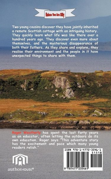 Two young cousins discover they have jointly inherited a remote Scottish cottage with an intriguing history. They quickly learn what life was like there over a hundred years ago - but they discover even more about themselves, their families and the mysterious disappearance of both their fathers. As they explore and share their own thoughts and emotions they realise their environment and the people in it have unexpected things to share with them. Roger Weatherly has spent the last forty years as an educator, often letting the outdoors do its own education. He lives in west Cornwall. Roger says "This adventure story has the momentum, excitement and pace which many young readers relish, but it also offers food for thought for readers of any age who recognise the impact a wilderness can have on young lives. Amidst the turmoil and humour, some of the big questions of life begin to surface. And what does "Unless you are silly" mean?" C. Roger Weatherly 2012.