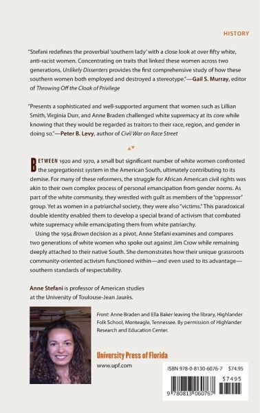 Between 1920 and 1970, a small but significant number of white women confronted white supremacy and the segregationist system in the American South, incontrovertibly contributing to its demise. Using the 1954 Brown decision as a pivot, Anne Stefani examines and compares two generations of white women who spoke out against Jim Crow while remaining deeply attached to their native South. For many white women reformers, the struggle for African American civil rights was linked to their own complex process of personal emancipation from gender norms. As part of the white community, southern white women felt guilt as members of the “oppressor” group. Yet as women in a patriarchal society, they were also “victims.” This paradoxical double identity forced them to develop a special brand of activism that combatted white supremacy while emancipating them from white patriarchy. In Unlikely Dissenters, Stefani shows how their unique grassroots community-oriented activismfunctioned within - and even used to its advantage - southern standards of respectability.