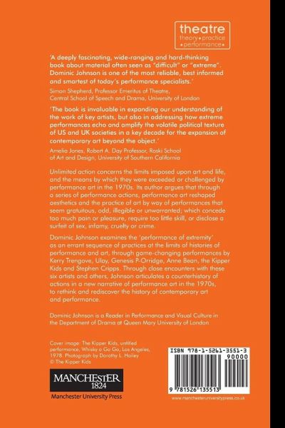 Extremity might suggest violence, pornography, criminality, misanthropy, danger, recklessness, eccentricity or obscurantism. How has art exceeded its own example through performance art? How have artists used performance to question and overextend the limits of form in the 1970s? And with what effects? -- .