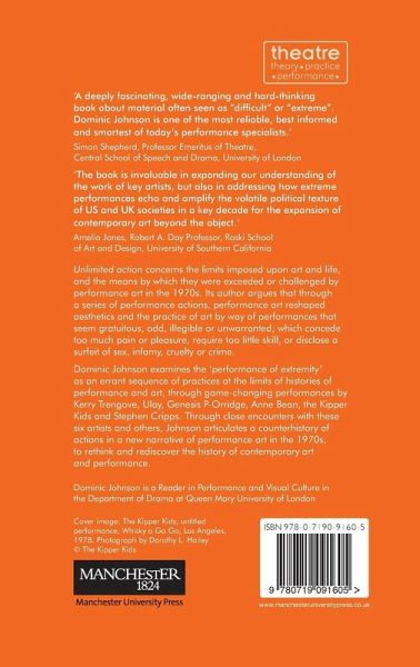Extremity might suggest violence, pornography, criminality, misanthropy, danger, recklessness, eccentricity or obscurantism. How has art exceeded its own example through performance art? How have artists used performance to question and overextend the limits of form in the 1970s? And with what effects? -- .