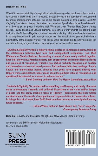 Rewrites the dominant narrative of the political work of lyric poetry in the United States since the nineteenth century. What if increased visibility of marginalized identities-a goal of much socially committed lyric poetry in the United States-does not necessarily lead to increased social recognition? For many contemporary scholars, this is the central question of lyric politics.Unlimited Eligibility? revisits and deeply historicizes this question. Ryan Cull explores the relationship of a diverse set of poets, including Walt Whitman, Jean Toomer, Hart Crane, James Merrill, Thylias Moss, and Claudia Rankine, to a series of movements intended to build inclusion: the St. Louis Hegelians, cultural pluralism, identity politics, and multiculturalism. In tracing the tensions in lyric poetry's merger with the pursuit of recognition, Cull offers a new history of the political work of lyric poetry while exposing the discursive roots of the nation's faltering progress toward becoming a more inclusive democracy.