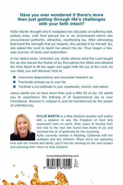 Have you ever wondered if there's more than just getting through life's challenges with your faith intact? Kyllie Martin thought she'd navigated two decades of suffering well, joyfully even, until God placed her in an environment where she encountered authentic, attractive, overflowing joy. After witnessing first-hand the strength that joy imparts, she wanted it for herself. So, she asked the Lord to teach her about His joy. Thus began a two-year journey of study and exploration.In her debut book, Unlimited Joy, Kyllie shares what the Lord taught her as she traced the theme of joy throughout the Bible and allowed the Holy Spirit to fill her again and again with the joy of the Lord. As you read, you will discover how to: ¿ Overcome despondency and encounter heaven's joy ¿ Practically activate joy in your life ¿ Facilitate a joy outbreak in your community, church, and nation! Jesus wants you to have more than just a little bit of joy. He wants you to experience the fullness of it! Supernatural joy is your inheritance. Receive it, release it, and be transformed by the power of unlimited joy.