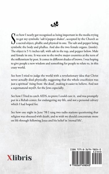 See how I nearly got recognised as being important in the media trying to get my symbolic 'salt'n'pepper shaker', accepted by the Church as a sacred object, phallic and physical in one. The salt and pepper being symbolic the body and phallus. And also the two female organs. (inside). The object is 5 1/2 inches tall, with salt in the top, and pepper below. Male and female in one. It was sent to the twelve major countries at the turn of the millennium by post. It comes in different shades of brown. I was hoping to give people a new wisdom and something for people to relate to, in this crazy world. See how I tried to judge the world with a revolutionary idea that Christ never actually died physically, suggesting that the whole crucifixion was just a spiritual 'rising from the dead', making it easier to believe. And not a supernatural mysÐ, for the Jews especially. See how I Tried to catch AIDS, to prove I could cure it, and was promptly put in a Rehab center, for endangering my life, and not a personal calvary which I had hoped for. See how one night in June '98 I rang two radio stations questioning that religion was obsessed with death, and to wish we should concentrate more on life through following Jesus and his belief in 'eternal life'.
